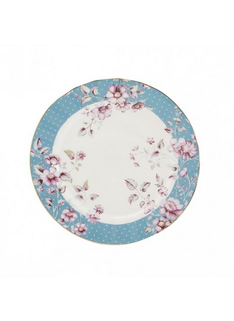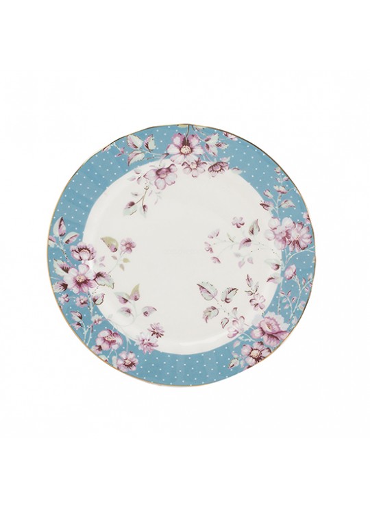 Plato de cerámica fina, porcelana china con flores delicadas en tonos berenjena y borde azul de Katie Alice