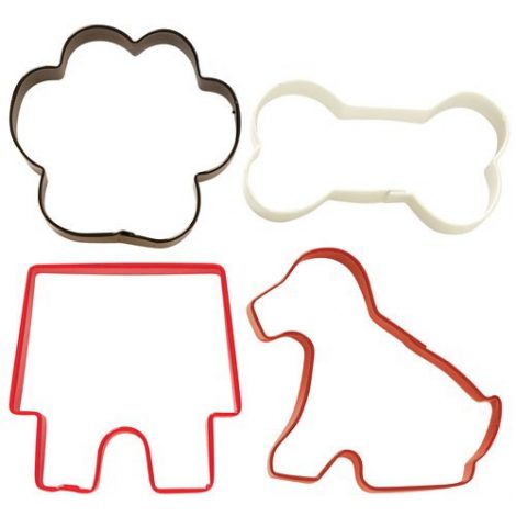 Set de 4 cortadores metálicos de color de la marca Wilton. Incluye cortador de perrito, de caseta, de huella y de hueso.
